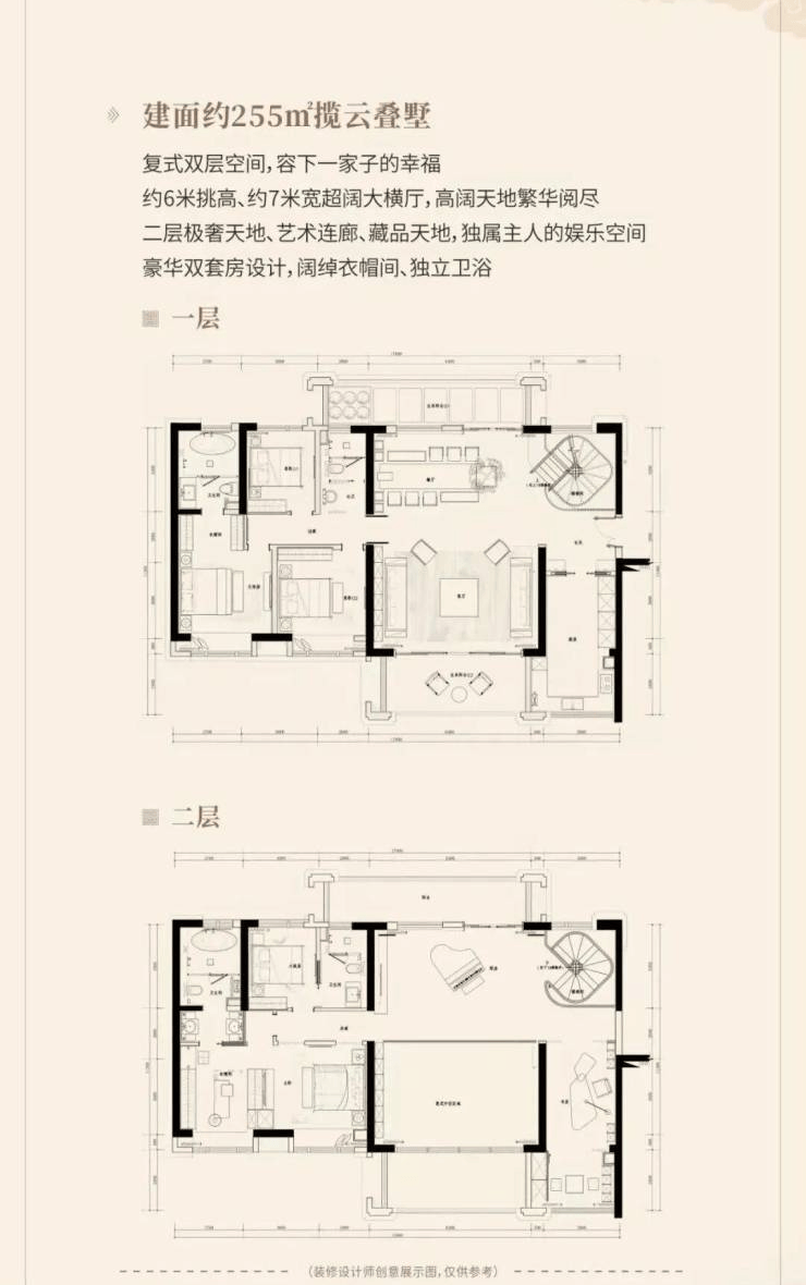 建面约440-837㎡国风院墅(总价约800万-2500万/套),建面约239-255㎡揽云叠墅(总价约500万-600万/套)