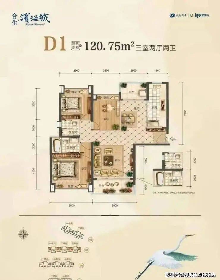3栋120㎡/3房2厅2卫户型图,南北通透,全明空间,清风环绕,双厅双阳台,前后视野好,可观山,观湖。
