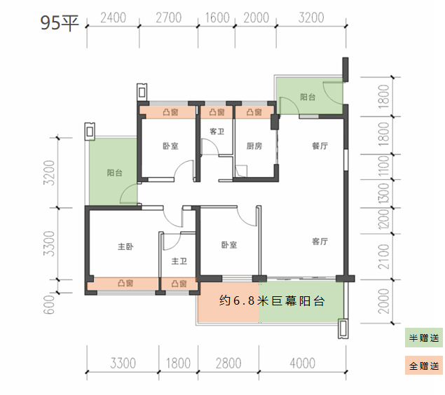 其中95平的3房2厅2卫朝南的户型,