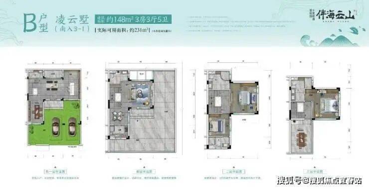 凌云墅B户型(南入户)建筑面积约148㎡,实际可用面积约231㎡(不计花园及露台)