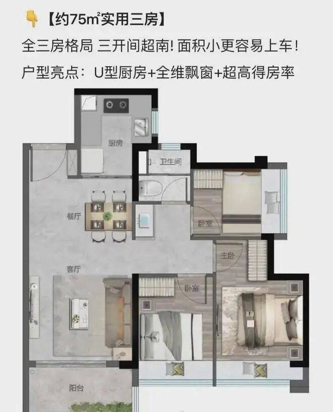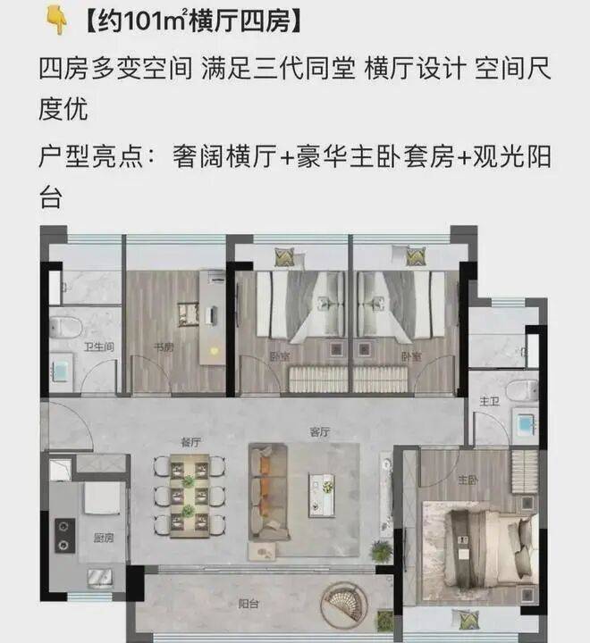 在售户型:75平3房两厅1卫,。86平3房两厅两卫,101平4房两厅两卫