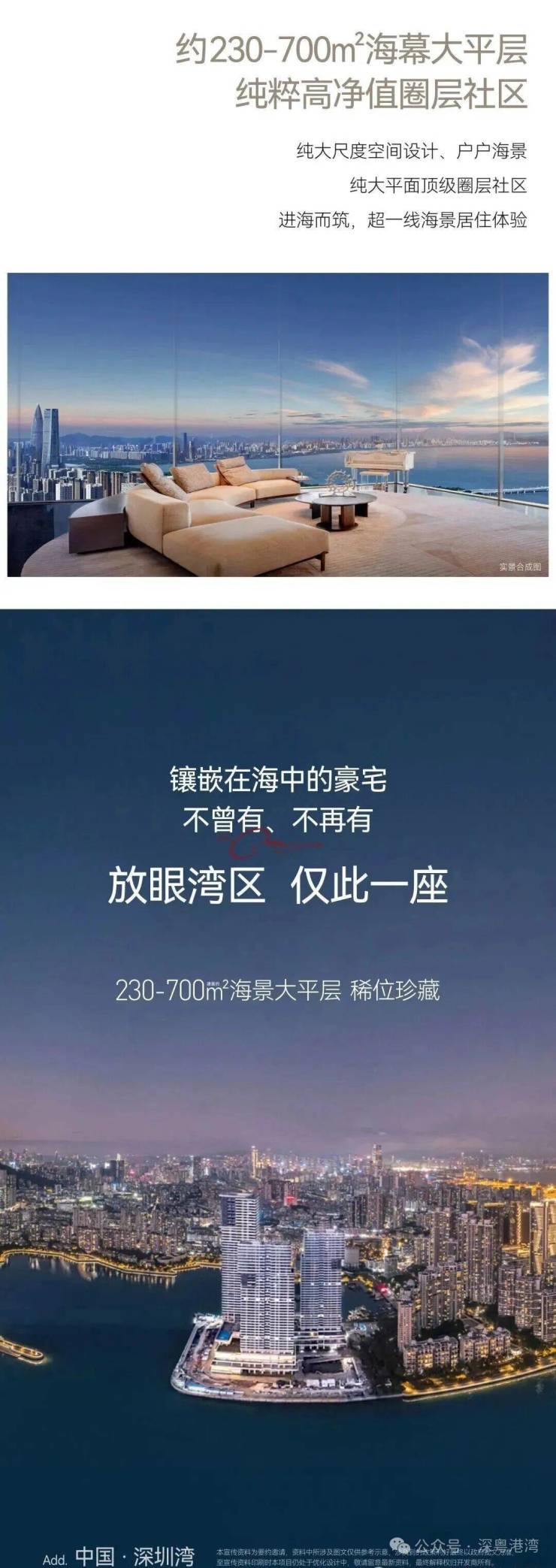 内部配套:配备高端私密会所、约 766 平方米的深圳首个悬空无边际海景泳池、首层城市花园、健身房、儿童游乐区以及 1800 平方米的海洋博物馆等设施。