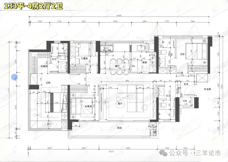 133㎡的4房2厅2卫,设计的是竖厅南北通透格局,进门入户玄关,客厅5.4米开间,餐客厅分离设计,分别做到了主卧24.5㎡/次卧10.2㎡/次卧8.96㎡/次卧7.84㎡(实测面积),客厅连接次卧出12.3m²的观景大阳台,L型中式+岛台灵动式厨房,公卫三段式干湿分离,得房率约78.27%(不含赠送),阳台主朝东南或西南向。靓点:超大客餐厅南北对流+8.2米长超大观景南向阳台,超大主卧+270°无柱转角飘窗+进门独立玄关800库。