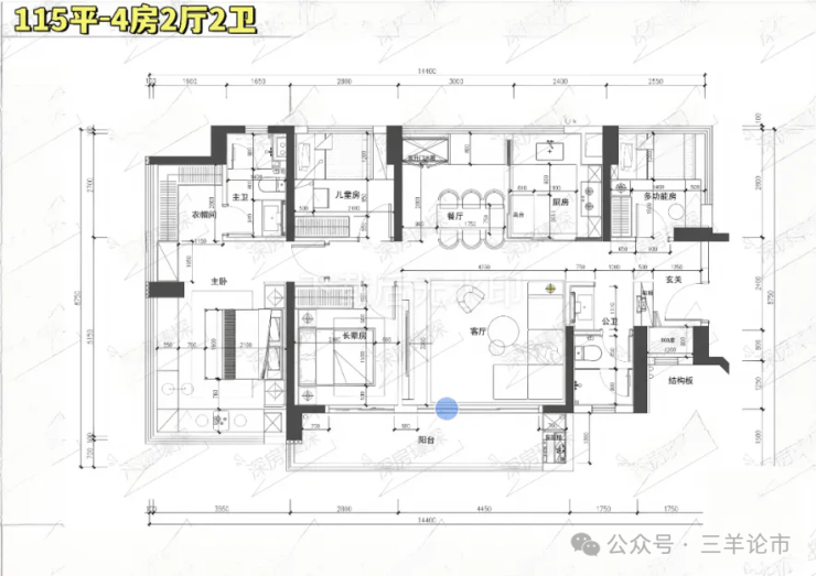 115㎡的4房2厅2卫,设计的是竖厅南北通透格局,进门入户玄关,客厅4.45米开间,餐客厅分离设计,分别做到了主卧23.45㎡/次卧8.96㎡/次卧7.84㎡/次卧7.68㎡(实测面积),客厅连接次卧出10.87m²的观景大阳台,L型中式+岛台灵动式厨房,公卫三段式干湿分离,得房率约78.27%(不含赠送),阳台主朝东南或西南向。靓点:南北对流+7.25米长超大观景南向阳台,超大主卧+270°无柱转角飘窗+进门独立玄关800库。