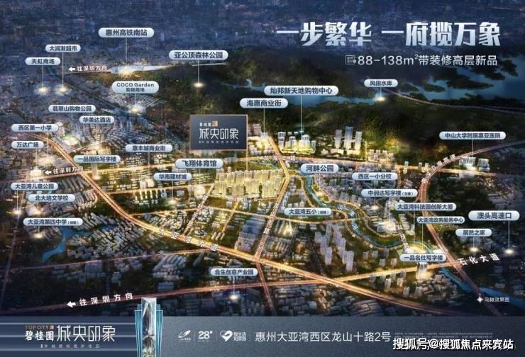 碧桂园·城央印象临近沿海高速、深汕高速和惠大高速,距离澳头高速收费站约1.5公里路程,毗邻龙山十路,紧邻大亚湾大道、龙海二路、石化大道。碧桂园·城央印象,占地约7.6万平米,总建面约33万平米,绿化率30%,容积率为3.2,项目主力户型建筑面积为90㎡-110㎡。