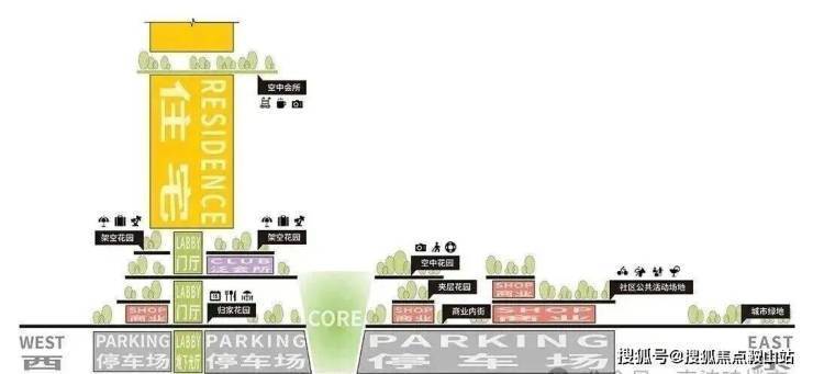 从这个侧面结构图来看,构造更接近于目前外国新晋的豪宅综合体,带有空中花园+架空花园+会所等多功能融合,底部还配备了一些街区商业,可以做一些轻奢或者高奢精品店。