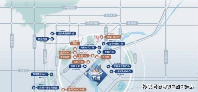 1公里内聚合行政集群(20+政务机构)、商务高地(万科/珠江等超百万方写字楼)、文化地标(25万㎡三馆一城)及七大商圈(万科广场、宝能all city等)