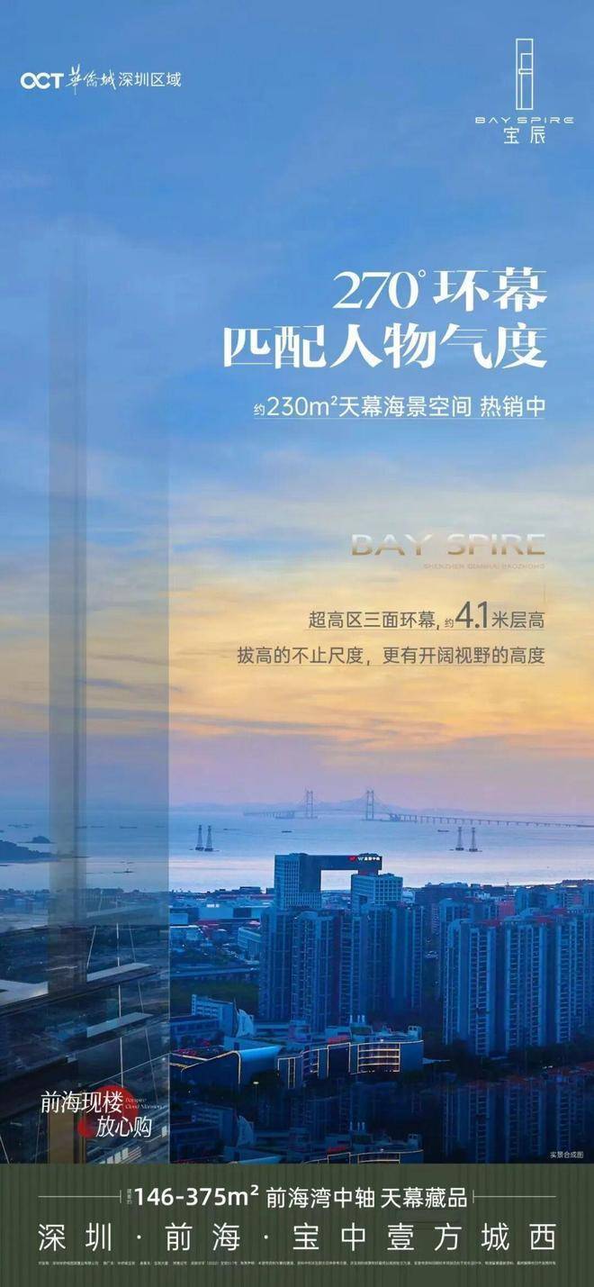 深圳华侨城宝辰是华侨城在前海宝中的代表作,位于宝安中心区政府西南侧,建筑高度约230米,是前海湾摩天建筑群中的一道独特风景线。该项目集城市中心配套、公园绿地、地铁商业、互联社交空间于一体,享有前海湾优越的区位要素,周边配套成熟,交通便利,是深圳西海岸上的湾区门户。项目主打建面约125-375㎡的天幕藏品,是城市湾区建筑群的新摩天生活范本。