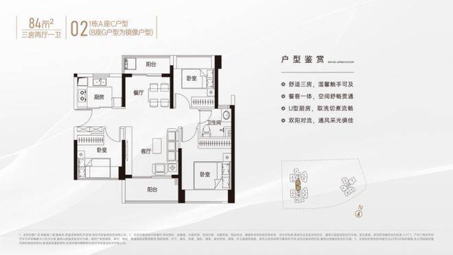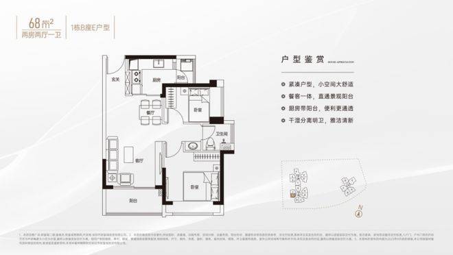 竖厅格局,客厅3.4米开间,LDKB一体化设计,动静分区,L型厨房还带1个生活阳台,卫生间三段式干湿分离,得房率约79%(不含赠送),东北朝向。