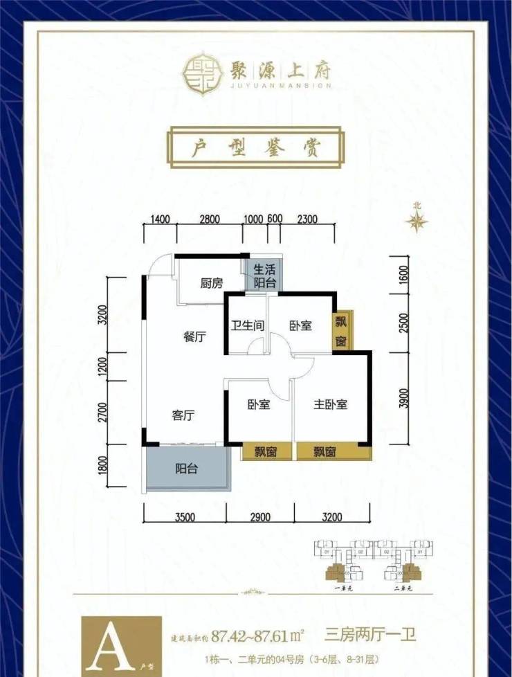 A户型:建筑面积约87.42-87.61㎡(三房两厅一卫)· 户型方正,户户朝南,南北通透· 主次卧均带飘窗,让阳光与新鲜空气充满生活的每一角落