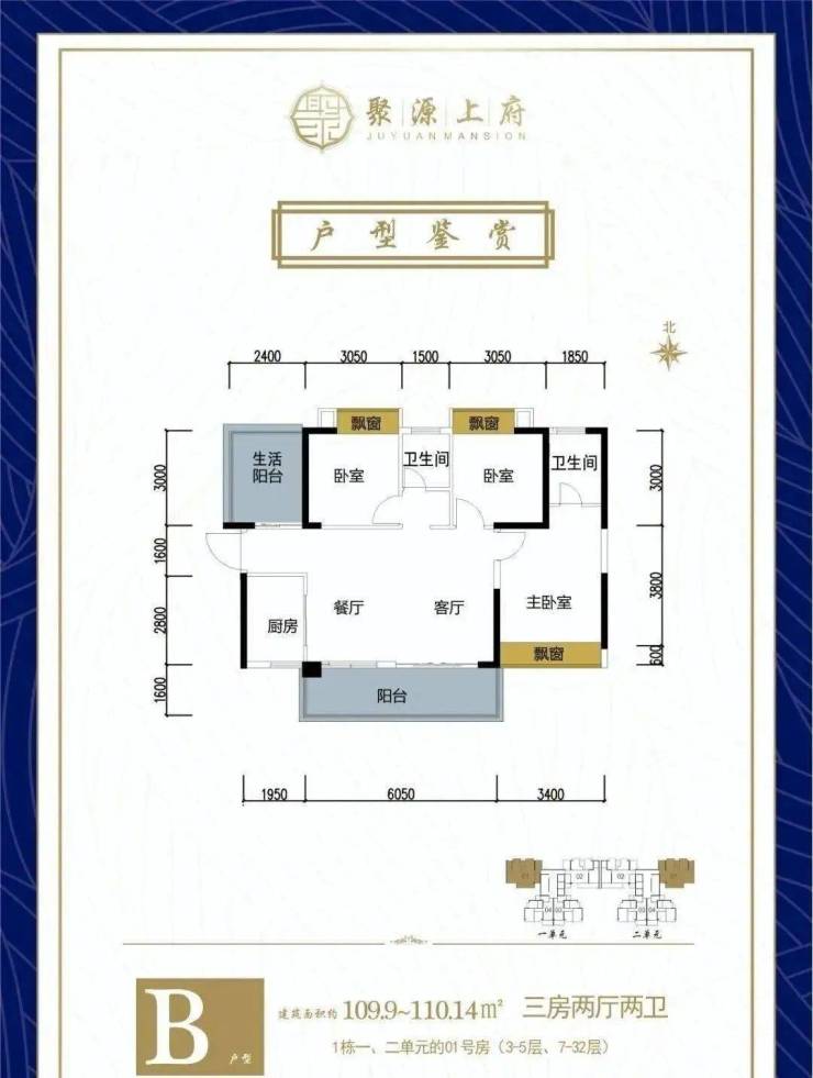 B户型:建筑面积约109.9~110.14㎡(三房两厅两卫)· 户户朝南,使用率高,满足生活需求· 两大阳台,采光通风俱佳