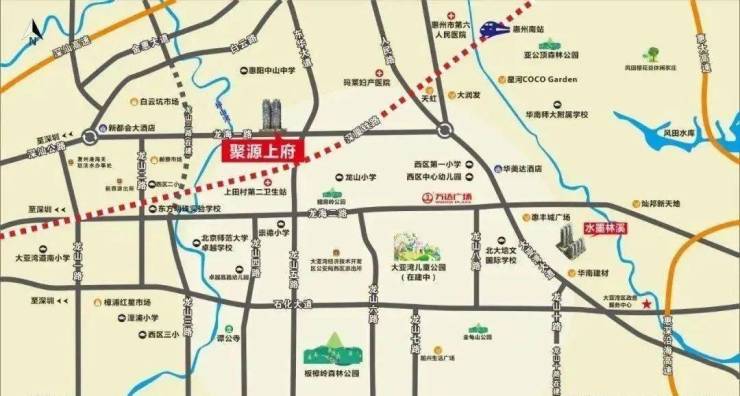 聚源上府地处大亚湾西区北片区,属临深区域。项目南侧紧邻龙海一路,东侧约550米为龙海一路与东华大道(龙山五路)交汇路口,西侧约450米为龙海一路坪山河大桥;龙海一路对面,即为晶地里程花园。