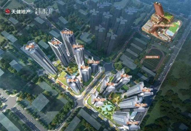 天健和悦府由天健集团打造,是在坪山的第一个项目,总占地面积约7.62万㎡,总建筑面积约32.8万㎡,计容建筑面积23.93万㎡,容积率4.77,绿化率40%,分东西2个地块开发,共由13栋21-45层高的住宅组成,总规划2833户,其中可售商品房1740套,规划停车位2599个,车位占比约1:0.91。