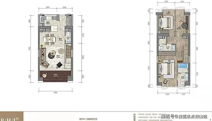 ★88㎡复式两房两厅三卫 双向通透采光,5.4米开间客厅及主卧,双套房周全设计,室内多变空间可根据家庭需要设置独特的功能。