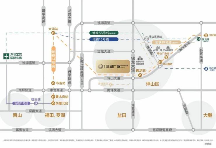 地铁:紧邻地铁14快线坪山门户站——锦龙站(约600米),12站福田岗厦北。周边临近地铁16号线(14号线一站直达坪山围站换乘)、地铁19号线(规划中)、地铁33号线(在建)。