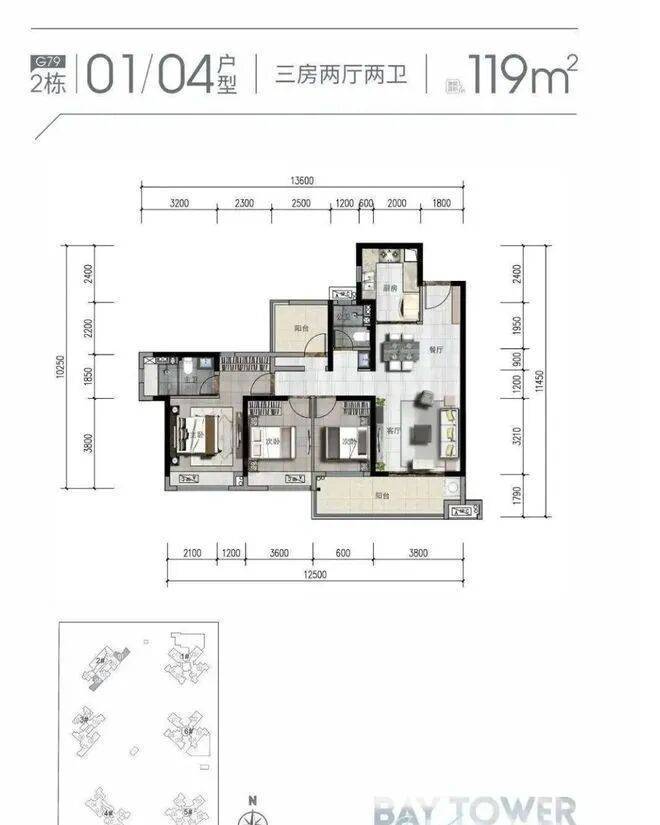 (1)119㎡三室两厅一卫(G83户型):户型方正,动静分离,采光充足。