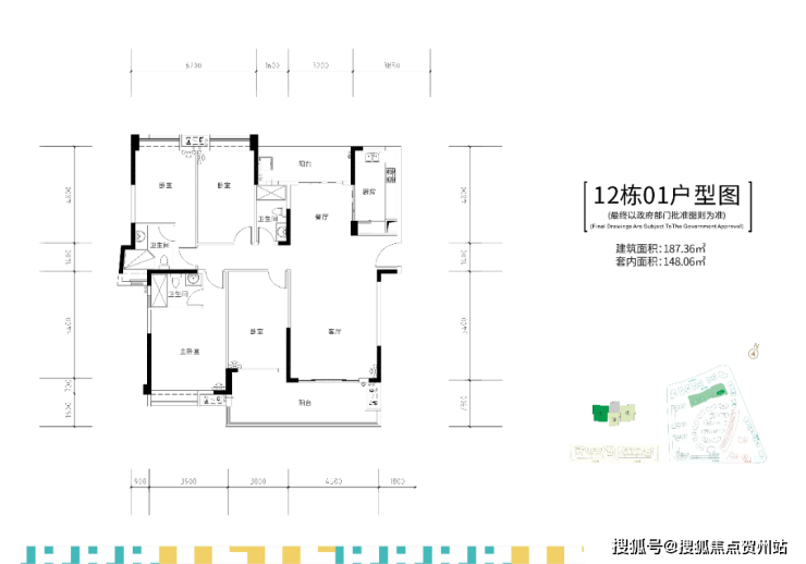 12栋两梯三户,建面约187㎡四房双套间户型。