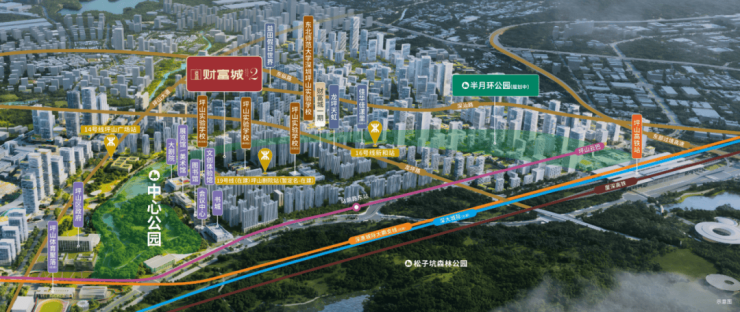 半月环公园(规划中):约48万㎡活力绿洲,链接城市繁华与自然纽带,财富城二期矗立半月环公园头排,将公园美景纳入塔尖居住视野,尽显“曼哈顿中央公园”式享受。