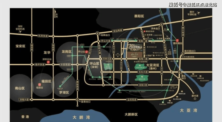 【交通】项目邻近沿海、深汕、惠大三大高速,南坪快线、高铁、地铁等交通网络畅达林立,畅享四通八达的立体交通;厦深高铁一站到深圳北,无缝对接深圳;30分钟即可拥抱极速便捷生活,成就人生通达之境。