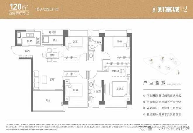 空间布局:竖厅双龙抱珠设计,客厅开间 4 米,四开间朝南,南北双阳台(南向景观阳台约 9.5㎡,北向生活阳台约 4.2㎡)。