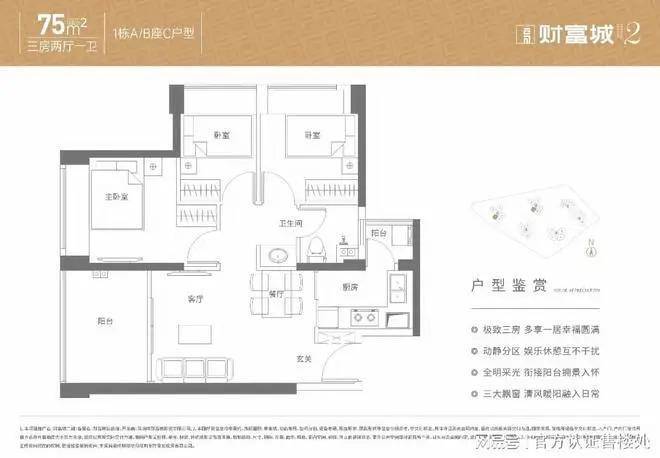 75㎡ 3 房 2 厅 1 卫(竖厅格局)