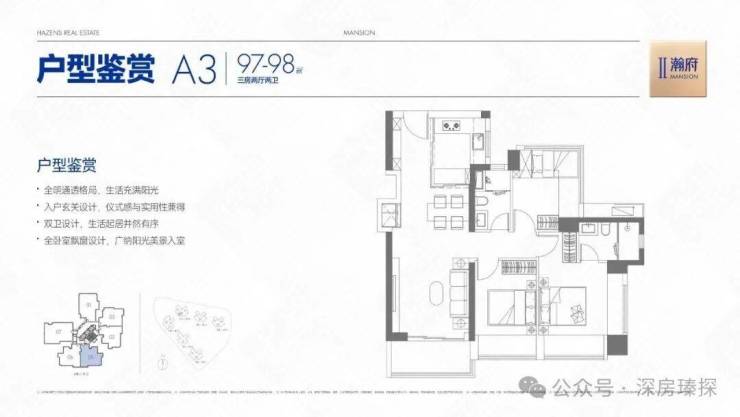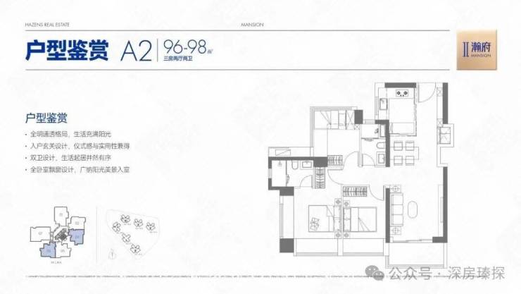 96-98㎡的3房2厅2卫,A2户型/2栋2单元03/06,设计的是经典竖厅格局,客厅3.5米开间,LDKB一体化,S墙设计预留冰箱卡槽位,动静分区,三开间朝南,主卧+1个次卧双飘窗,得房率约78%(不含赠送),U型厨房,卫生间干湿分离,西南或东南朝向。