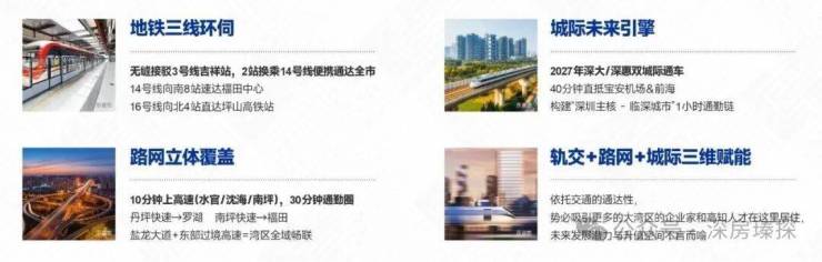 交通配套:项目自驾10分钟接入水官高速、沈海高速,15分钟接外环高速,通过龙岗大道等主干道快速联通全市,目前已经开通运营的3号地铁线“吉祥站”距离约300米,2站到大运枢纽,可换乘14/16号地铁线,6站到罗湖,7站到福田,以及深大城际2站到五和,5站到石岩,4站到龙城公园站还可以换乘深惠城际线路,4站到深圳北站,5站到南山。
