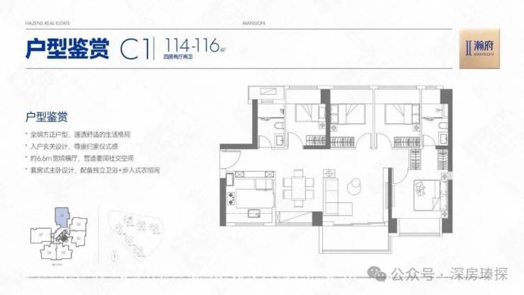 114㎡的4房2厅2卫,C1户型,设计的是横厅南北通透格局,客餐厅6.6米开间,LDKB一体化设计,四开间朝南,全屋7面飘窗,主卧套房+步入式衣帽间,3个次卧朝西北向,得房率约78%(不含赠送),U型厨房,卫生间干湿分离,东南朝向。