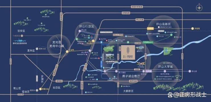 项目坐拥"三轨四线"立体路网,东侧300米规划中的19号线南布站如卧龙潜渊,12个站点串联起横岗至坑梓的城市脉络。南侧2公里处,16号线与深惠城际大鹏支线双轨交汇,160公里时速的城际铁路2026年通车后,将实现与大鹏新区的快速联通。南坪快速与坪盐通道构成黄金双轴,3公里直达龙坪立交,宛若玉带缠腰般贯通深圳东西。云巴1号线更似彩虹飞渡,将坪山高铁站与城市中心紧密相连。