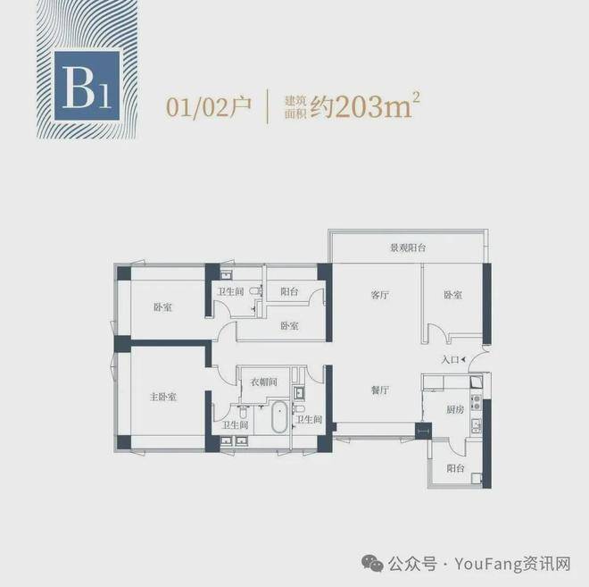 1栋二单元B1户型:面积约为203㎡;