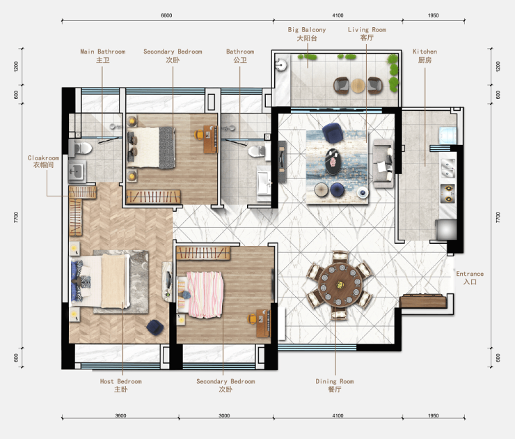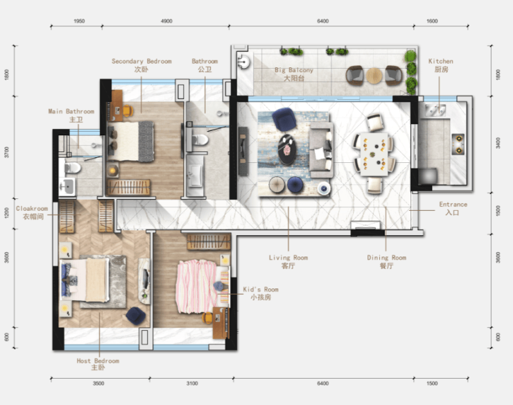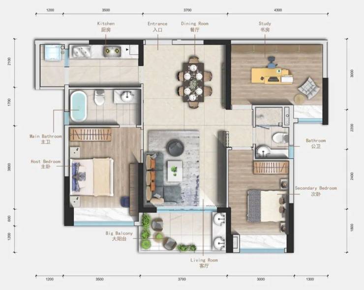 21.35㎡超大起居空间(3.7m面宽,7.6m进深)