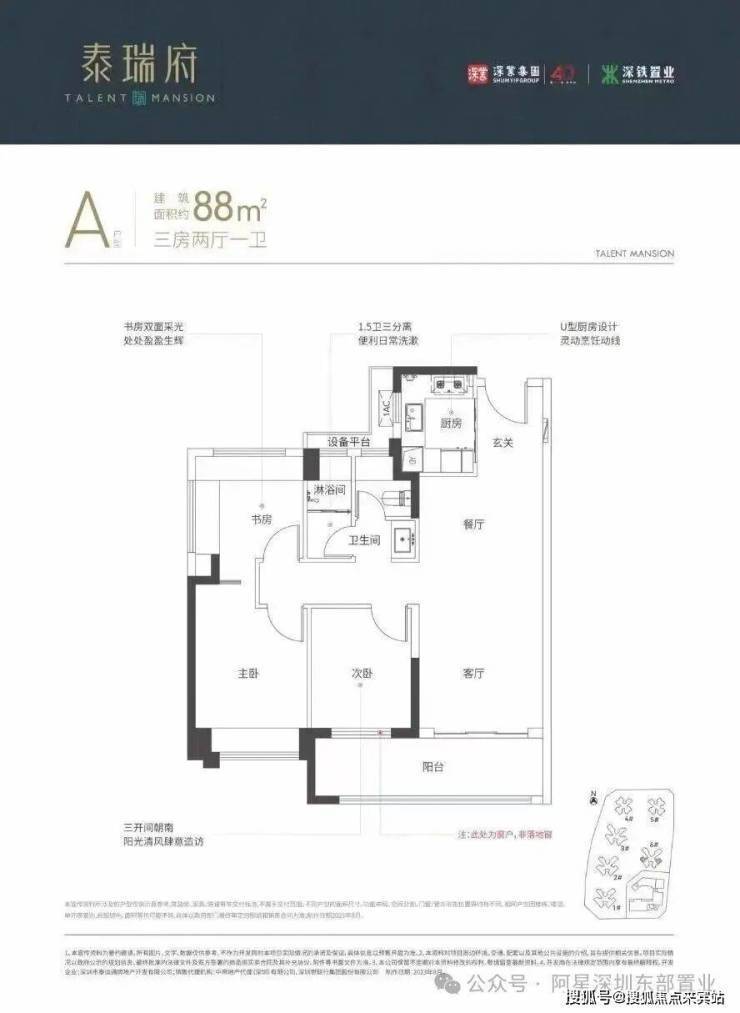 88mm的3房2厅1卫,设计的竖厅格局,客厅连着卧室出大阳台,U型厨房,有东南朝向及西南朝向。