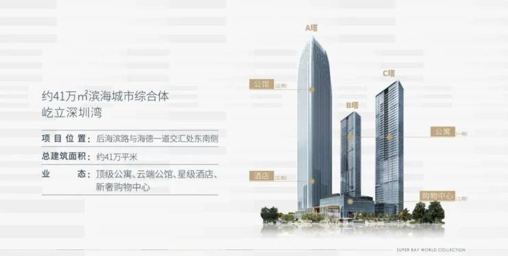项目总占地约2.5万㎡,总建面41万㎡,包含三栋超高层建筑(最高310米)及下沉式商业,是深圳湾片区稀缺的地标性物业。定位为集超甲级写字楼、高端公寓、都会商业于一体的滨海城市综合体。