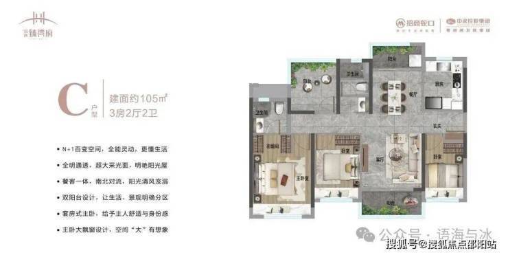 105㎡3+1房:南北双阳台设计,南向6米景观阳台,主卧套房带独立衣帽间,改善升级首选。