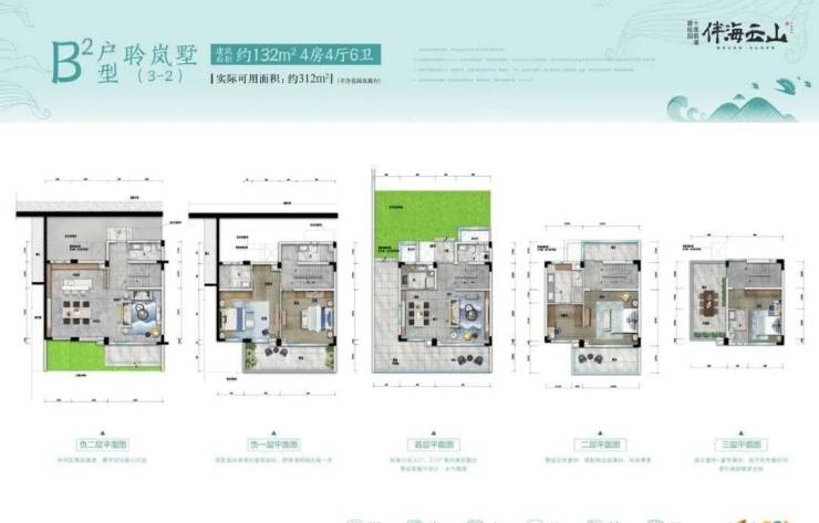 聆岚墅B2户型:建筑面积约132㎡,实际可用面积约312㎡(不计花园及露台)
