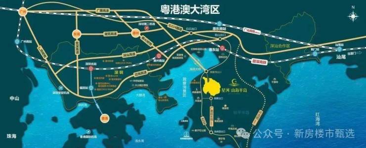 星河山海半岛,位于巽寮旅游度假区门户位置,享有“四高速、一高铁、一机场”三维立体交通网,项目距离高速出口仅6KM,厦深高铁惠东站距离深圳北站仅40分钟车程;未来将规划广惠高速延长线,项目内设有高速出口;另有在建的广汕高铁,深圳第二机场(惠州平潭机场)以及规划中的海上航线,未来将实现海、陆、空全线打通,轻松享受深广1.5小时黄金度假圈生活。