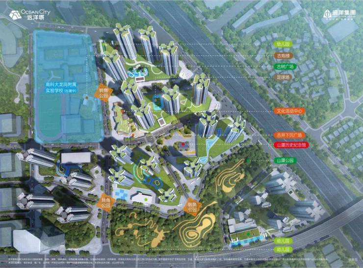 深圳远洋城,超百万方全配套综合大城,家门口南科大龙岗附属实验学校(在建中),家门口山厦公园,规划有3所幼儿园、约4万平米商业、文化活动中心、文化主题园林、四大主题泛会所架空层、写字楼等,以古树广场搭建人文住区的首开地块,为大城幸福生活赋能。