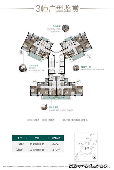 约102-119三房、130-143㎡四房,半山之上户户朝南,全明通透。超阔楼间距,无遮挡视野,至美风光推窗即享。餐客通厅,南北双阳台设计,套房式主卧,U型厨房,卫浴三段式干湿分离等匠心设计,为居者提供美好生活主场