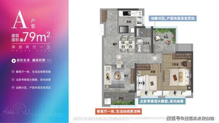 约79㎡两房两厅一卫是整个项目面积最小的户型,是典型的竖厅设计。