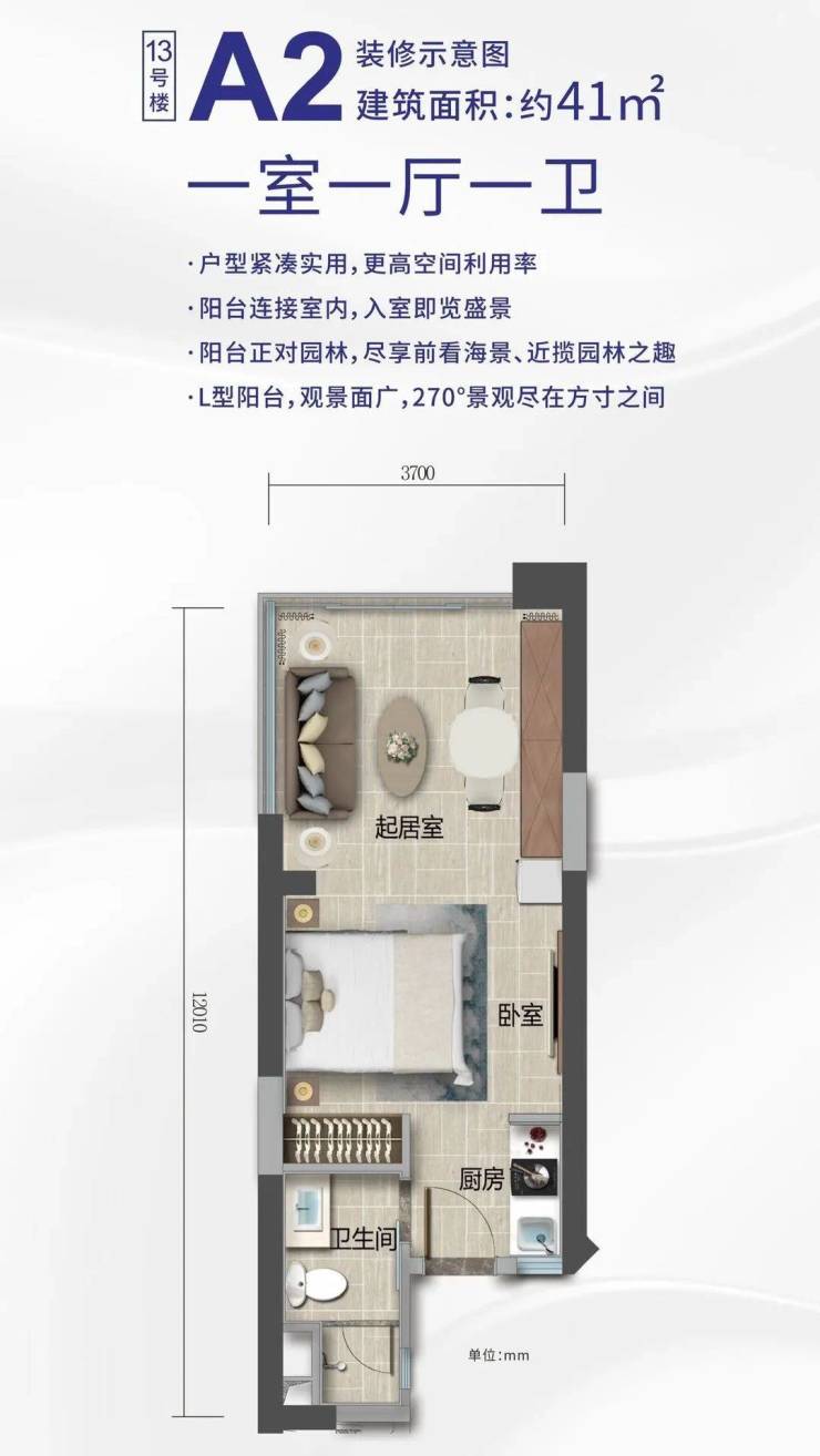产品面积:约40㎡-89㎡(单房-两房)