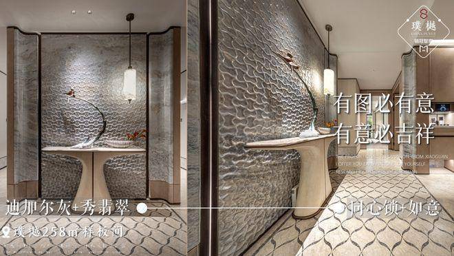 你还会忍不住去摸一摸,背景墙上的祥云纹凹凸纹理形成了一道道水波纹,形状是「元宝」,是财富到家的寓意。