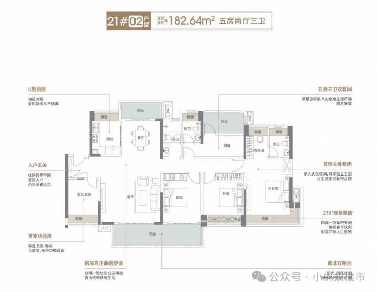 182㎡四房双套间:五开间朝南,主卧270°转角飘窗,南北双阳台,短进深设计让阳光无死角渗透。