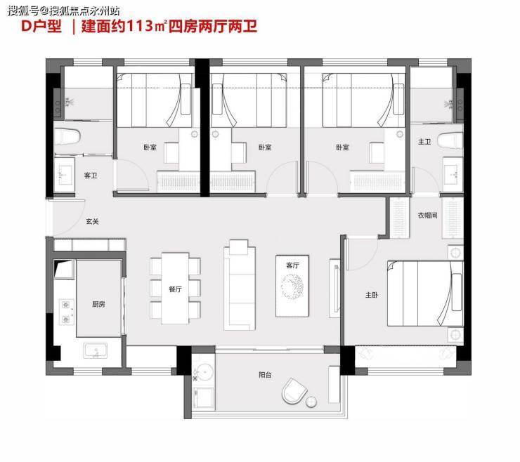 D户型|建面约113㎡四房两厅两卫:户型方正大气,宽敞横厅设计,U型奢阔厨房,轩敞主卧带独立衣帽间、卫生间,270度观景阳台,至阔南向面宽。