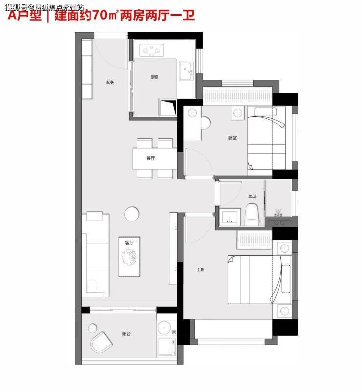 A户型|建面约70㎡两房两厅一卫:户型方正通透,全南向布局;U型厨房设计,合理分区;客餐厅一体化;卧室全飘窗,雅致通透。
