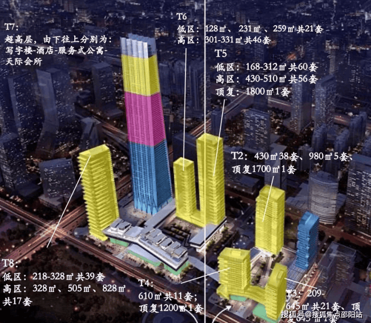北区T1是写字楼,T2、T3、T4为公寓,南区T5、T6、T8为公寓,T7为环球商务中心;总建筑面积47.5万㎡。