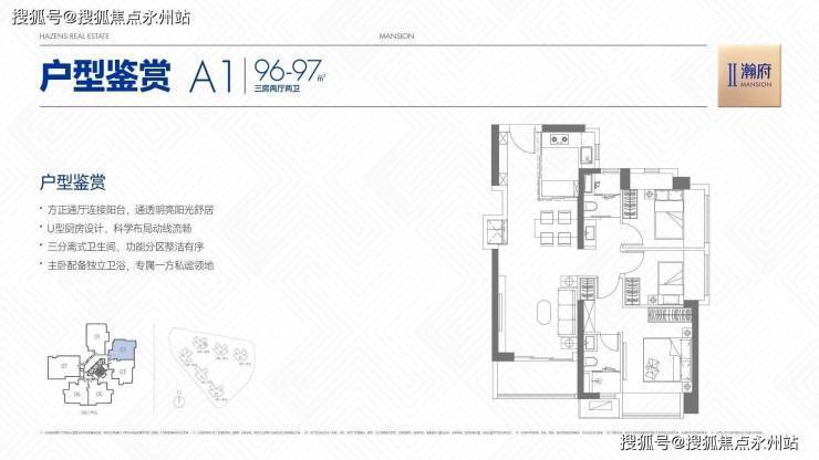 96-97㎡3房2厅2卫02(A1)户型,设计的是竖厅两个半开间朝东南,客厅开间3.5米,LDKB一体化,S墙设计预留冰箱卡槽位,动静分区,次卧东北向。