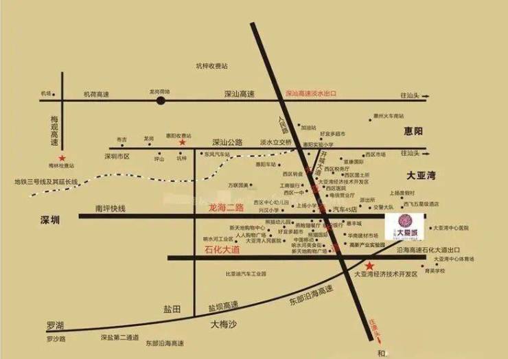 万达商圈的命名主要是因为大亚湾的万达商圈坐落于此,这里距离深圳地界7-9公里,这个片区的主要突出优势是教育,商业以及休闲配套成熟!
