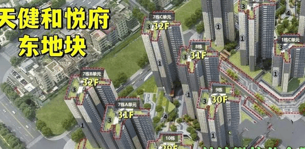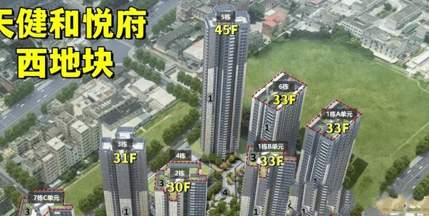 天健和悦府,由天健集团打造,总占地面积约7.62万㎡,总建筑面积约32.8万㎡,计容建筑面积23.93万㎡,容积率4.77,绿化率40%,分东西2个地块开发,共由13栋21-45层高的住宅组成,总规划2833户,其中可售商品房1740套,规划停车位2599个,车位占比约1:0.91。