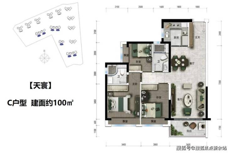 约98㎡的三房两卫,约5.7米阳台+主卧套房+U型明厨,空间感很足。