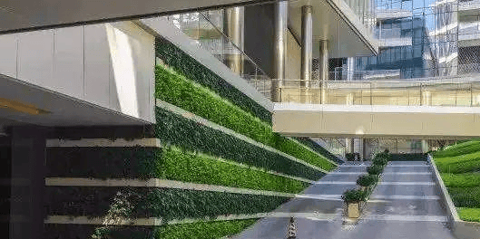 高层区地下车库入口景观,坡道空间通过设置廊架及绿化围合,形成富有层次、绿化掩映的地下车库入口景观。